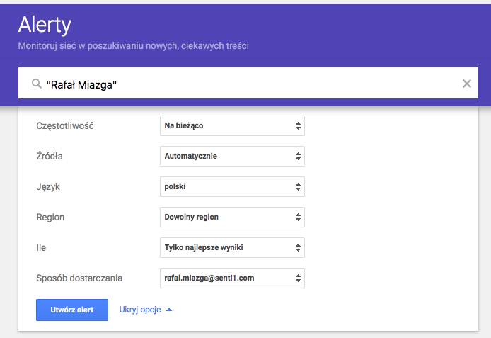 Tworzenie powiadomienia mailowego w Google Alerts.