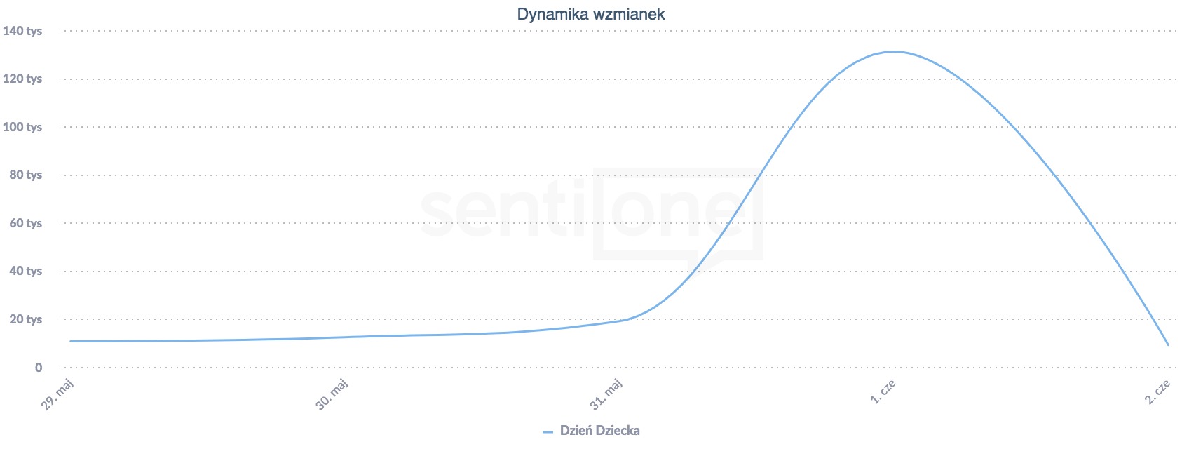 A szkoda, bo jak widać po wykresie dynamiki wzmianek ze słowami “Dzień Dziecka”, potencjał jest duży (wolumen dyskusji w tym tygodniu wyniósł prawie 200.000 wzmianek!) :