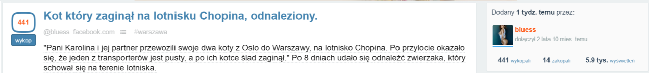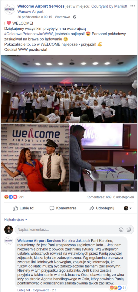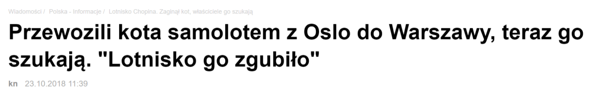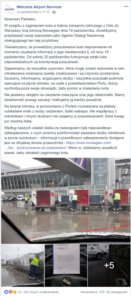 Partner Karoliny (autorki słynnego posta) wracał z dwoma kotami z Oslo. Nadał dwie kocie klatki na lotnisku wylotowym i otrzymał dwie na lotnisku przylotu. Niestety… jedna była otwarta i pusta. Minął piątek wieczór, weekend i w poniedziałek rano Karolina opublikowała post z prośbą o wywarcie presji na wszystkich możliwych podmiotach. Kota jak nie było, tak nie ma.