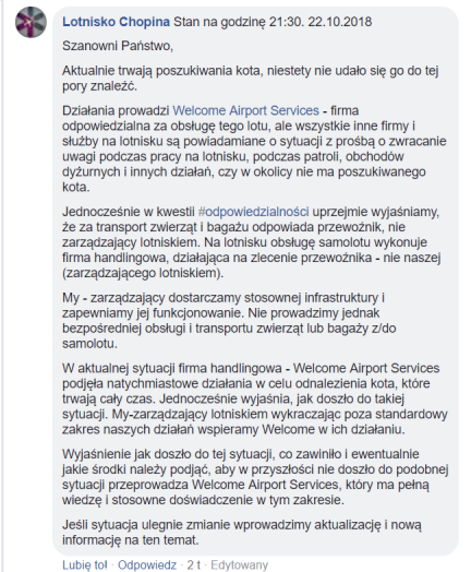Lotnisko Chopina: szukamy kota, a właściwie szuka WAS. „W kwestii #odpowiedzialności”, to odpowiada przewoźnik (Norwegian), a potem WAS. Ale my i tak robimy więcej, niż musimy, bo im pomagamy, bo to wcale nie nasz problem.