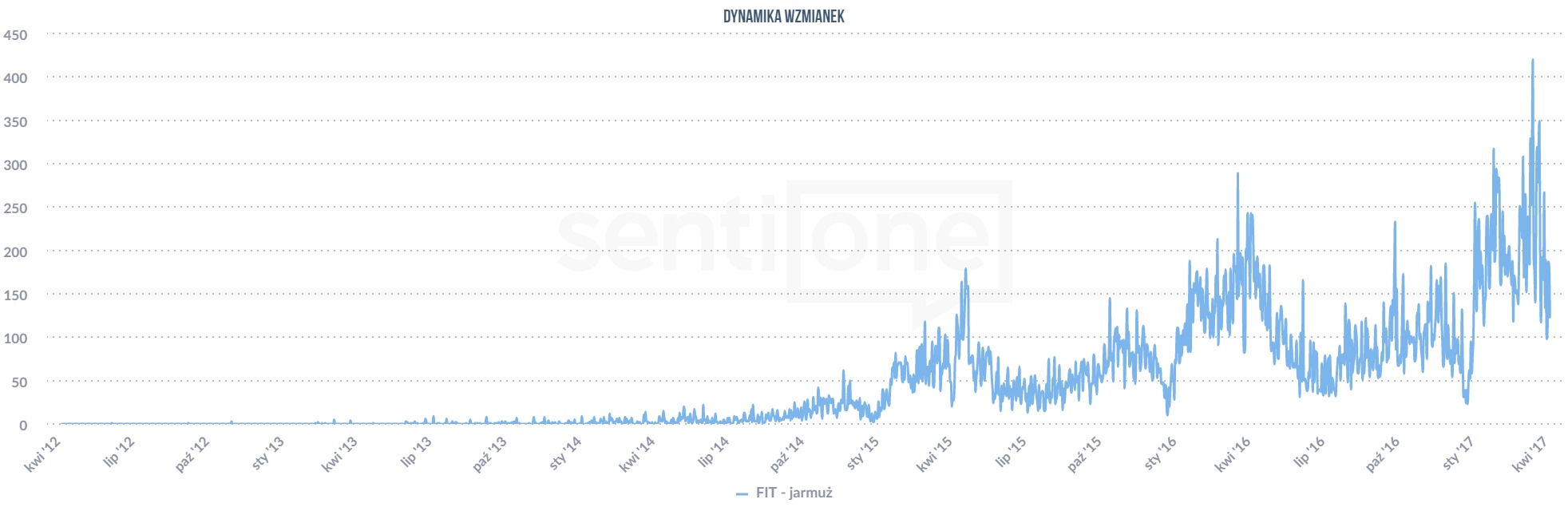 Dobrze, ale dlaczego o tym wspominamy? Dlatego, że zastanawiając się nad tym czy polski internet jest FIT ustaliliśmy sobie punkt wyjścia – właśnie ostatnie pięć lat. Na początek sprawdziliśmy, jak upływający czas wpłynął na zainteresowanie internautów tak popularnym dziś jarmużem. Z obawy przed zbyt dużą liczbą wyników zawęziliśmy wyniki wyszukiwania do instagrama. Okazało się, że w roku 2012 na tym portalu pojawiło się zaledwie… 18 wzmianek o jarmużu! Rok później, niezbyt imponująca suma 138 jarmużowych hashtagów. Jednak patrząc na ubiegły rok, okazuje się, że… nie było dnia, w którym na instagramie nie zagościłby jarmuż! 38067 wzmianek – czyli ponad cztery na godzinę!
