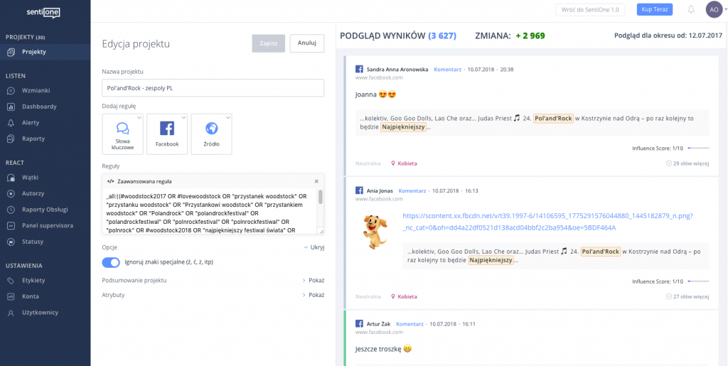 Dzięki odpowiednio przygotowanym projektom możemy podpiąć je pod SentiOne React – my postanowiliśmy wyodrębnić np. wpisy w profilach naszych partnerów czy zespołów występujących na Festiwalu – tak by mieć pewność, że od razu będziemy w stanie je skomentować i podziękować za wspólne granie.