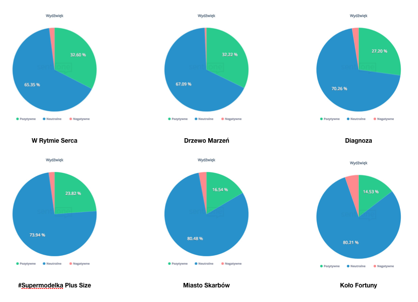 Oczywiście trudno mierzyć buzz wokół nowej ramówki samą liczbą wzmianek – niektóre programy później miały premierę, inne emitowane są częściej (widzieliśmy już np. trzy odcinki “Diagnozy”, tylko dwa “W Rytmie Serca” i “Miasta Skarbów”). Dla pełnej jasności przyjrzyjmy się jeszcze wydźwiękowi wypowiedzi na temat poszczególnych z nich. Najwięcej pozytywnych wzmianek zebrał “W Rytmie Serca”, niemal na równi z “Drzewem Marzeń”.