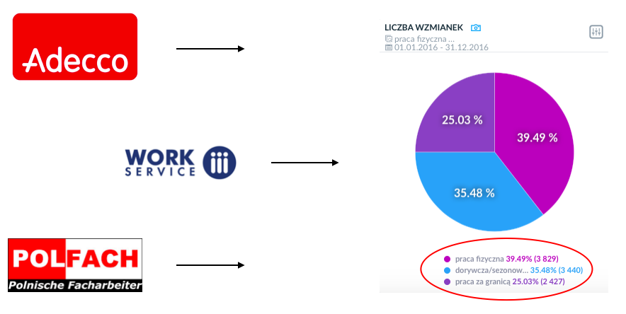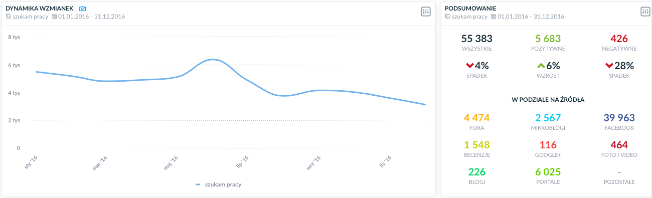 Wyniki wyszukiwania dla haseł: „szukam pracy”, „poszukuję pracy”, „podejmę pracę” w okresie 1.01.2016 – 31.12.2016. Źródło: SentiOne
