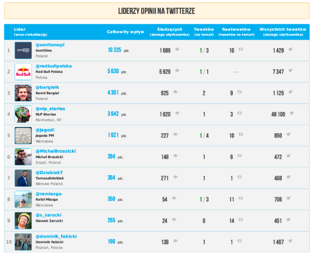 Kolejna część raportu, to lista osób najbardziej opiniotwórczych na Twitterze. Tutaj analogicznie do Facebooka zostały umieszczone informacje na temat całkowitego wpływu danego lidera, liczby obserwujących, tweetów i retweetów.