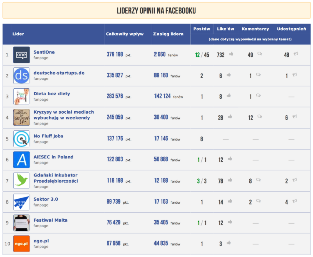 Pierwsza część jest poświęcona liderom opinii z Facebooka. W tym miejscu znajdziecie informacje na temat całkowitego wpływu lidera oraz liczby jego: fanów, postów, like’ów, udostępnień oraz komentarzy z wyszczególnieniem sentymentu.