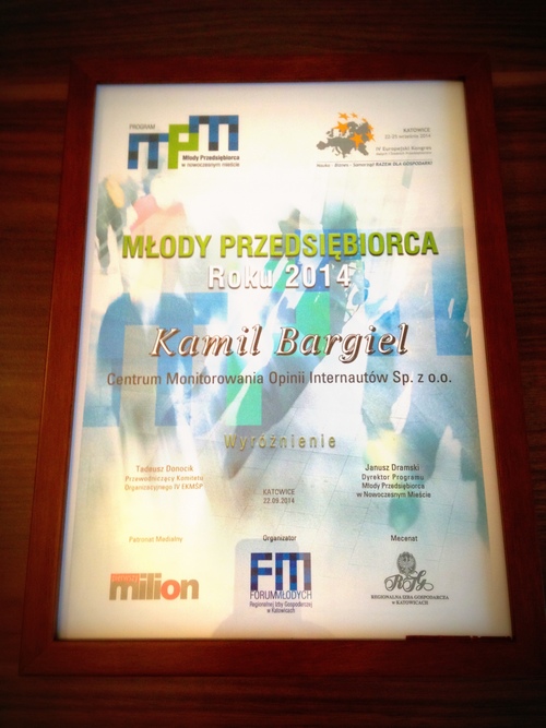 SentiOne zostało laureatem nagrody Młody Przedsiębiorca Roku 2014. Nagrodę z rąk organizatorów odebrał wczoraj, podczas gali towarzyszącej IV Europejskiemu Kongresowi Małych i Średnich Przedsiębiorstw w Katowicach, Kamil Bargiel, CEO SentiOne.