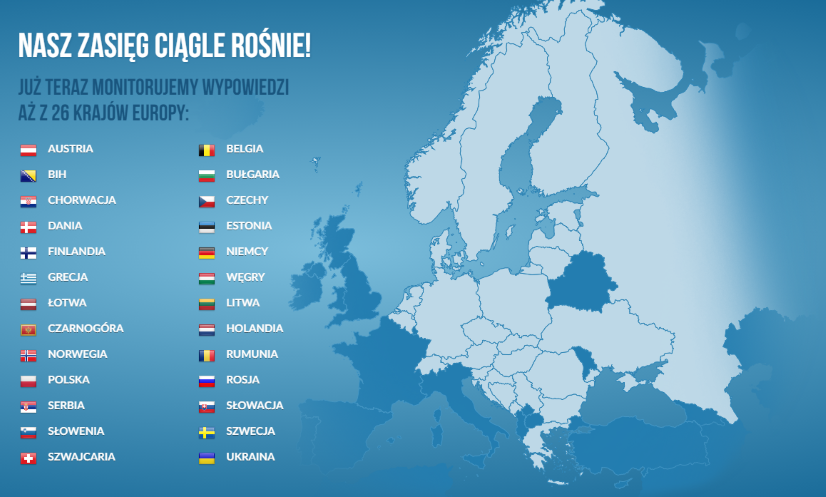 Internet to przestrzeń, w której entuzjaści dzielą się opiniami o marce. To miejsce, w którym szuka się informacji, rady czy rozwiązania problemów. Internauci komentują rzeczywistość dzieląc się własnym zdaniem i uczuciami. Dziś żadna firma nie może być obojętna wobec potencjału, które niosą ze sobą możliwości internetu. Umożliwiamy monitoring portali społecznościowych, mikroblogów, blogów, for internetowych i portali w ponad 20 językach europejskich. Dzięki współpracy z zagranicznymi analitykami, mamy możliwość dokładnego poznania i analizowani lokalnych rynków. Dziś SentiOne monitoruje internet w 23 krajach, w Polsce, Austrii, Belgii, Bośni i Hercegowinie, Bułgarii, Chorwacji, Czechach, Danii, Estonii, Finlandii, Grecji, Holandii, na Litwie, Łotwie, w Niemczech, Norwegii, Rumunii, Serbii, Słowacji, Słowenii, Szwajcarii, Szwecji i na Węgrzech.
