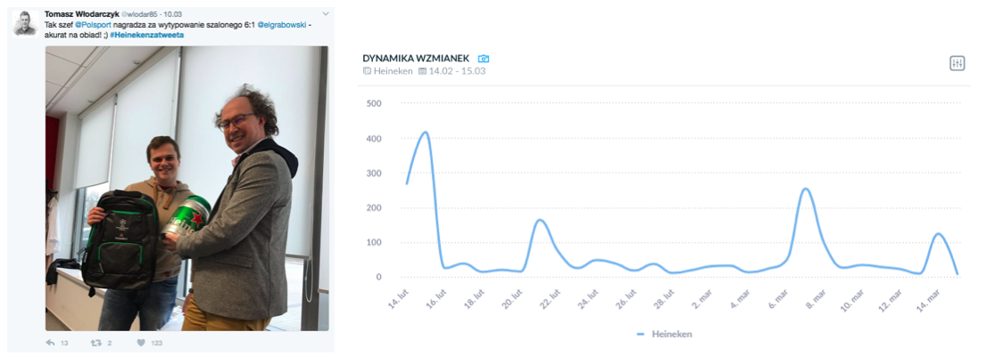 Pierwsze zdziwienie to najbardziej spektakularny skok (115 pozycji!) w porównaniu do poprzedniego Social Indexu, czyli Heineken. Wystarczy jednak chwila przy monitoringu internetu, by dowiedzieć się, że trend ten spowodowany jest powrotem piłkarskiej Ligi Mistrzów, a z nią prowadzonego przez Michała Pola na Twitterze konkursu #Heinekenzatweeta, w którym do wygrania była beczka piwa. Konwencja jest prosta – wystarczy wytypować wynik, używając hashtaga! Tylko w jednym dniu meczowym takie zagranie dało marce prawie + 500 punktów do liczby wzmianek.