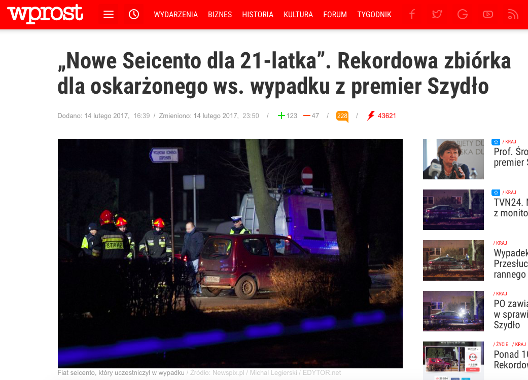Z najbardziej medialnych wydarzeń w lutym wpływ na internetowe dyskusje miał wypadek premier Beaty Szydło. Duża liczba słów wsparcia i pozytywnych wypowiedzi poskutkowała wzrostem w rankingu – podobnie, jak w przypadku Fiata, którym jechał kierowca. Nie bez znaczenia była w tym przypadku także kontrowersyjna zbiórka na nowe auto dla 21-latka.
