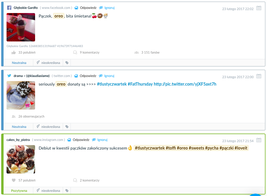 Jak wiadomo huczna impreza bez alkoholu obyć się nie może, jednak czym byłaby bez przekąsek i deserów? Raffaello, Milka i Oreo urosły nie tylko ze względu na słodycze wyprodukowane z ich logotypami wykorzystywane były też w dyskusjach jako nazwy i składniki ciast i tortów. Oreo szczególnie zyskało w okolicach tłustego czwartku: