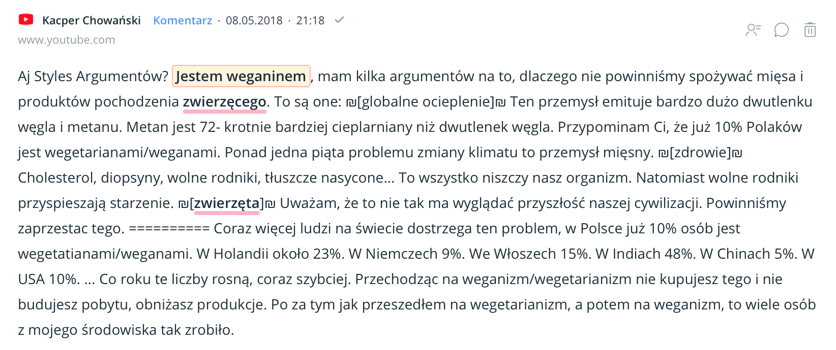 Donald Watson stworzył termin „weganizm” w 1944 roku. Od tego czasu zainteresowanie weganizmem rozwija się nieprzerwanie. Wciągu 5 lat liczba wzmianek na temat wykuczania produktów odzwierzęcych wzrosła o kilka tysięcy procent. Weganizm przestał być tylko dietą wykluczającą mięso, a zaczął całą ideologią. Najwięcej na ten temat publikują w Polsce kobiety, a trzy czwarte wspomnianych dyskusji toczy się w mediach społecznościowych. Ponieważ konfiguracja projektu w Sentione wymaga dokładnego predefiniowania badanego tematu, mój wpis porusza ledwie kilka aspektów związanych z dyskusjami na temat weganizmu w sieci. Jestem przekonana, że różne aspekty związane z byciem WEGE możemy analizować w nieskończoność.