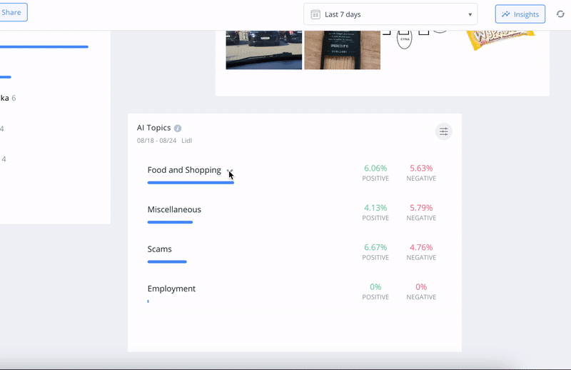 - AI Topics: The AI Topics widget is here to help you find the most discussed themes among mentions in your projects. AI Topics groups result into common themes and show the five most frequently appearing ones. You can check the ratios of positive and negative mentions, read the summary of each topic, and, if you’re more curious, also read the mentions related to the chosen topic.