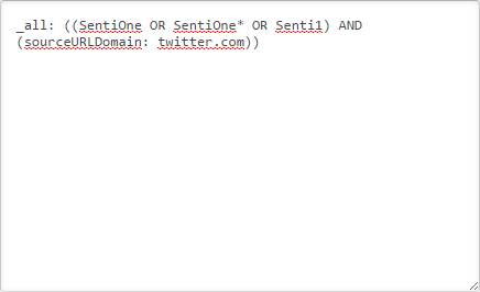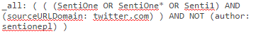 To sum up – such query will collect mentions from threads where one of those keywords: SentiOne, SentiOne* or Senti1 were mentioned, that were posted within the twitter.com domain.