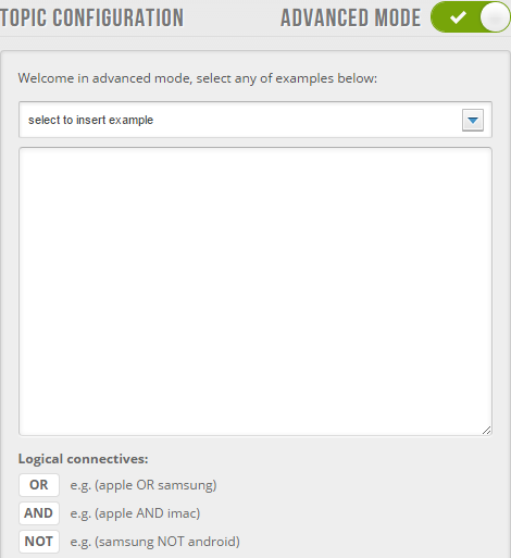 (SentiOne OR SentiOne* OR Senti1) – those are the keywords you want your query to look for. You can use quotation marks and tildes exactly the same way you do in basic topic configuration. OR indicator states that if least one of those keywords appears in a mention, the query will find it.