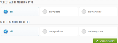 The next options allow you to decide whether you want to be notified about posts, articles or both and decide what mention’s sentiment should generate an alert – you can only receive notifications about negative or positive mentions. Clicking the “Create new alert” will set up an alert according to the settings.