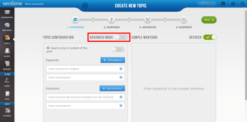 The first thing you need to do is to set up a new topic in the advanced mode. To start advanced mode, move the “Advanced mode” switch by clicking it.