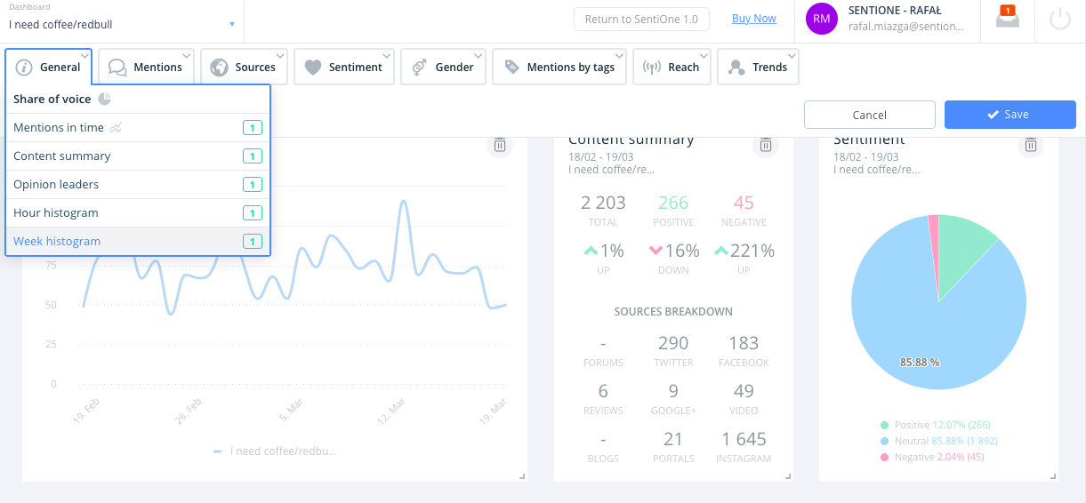 Keeping in mind the examples above, Monday would naturally be the best day for advertising coffee or energy drinks… at what time? To which target group? In what kind of manner? You’ll find all the answers in SentiOne, of course!