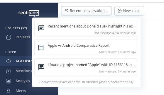 Easily revisit your discussions – quick access to up to 5 of your most recent conversations with the Assistant. Importantly, your chats are saved even after refreshing the browser.