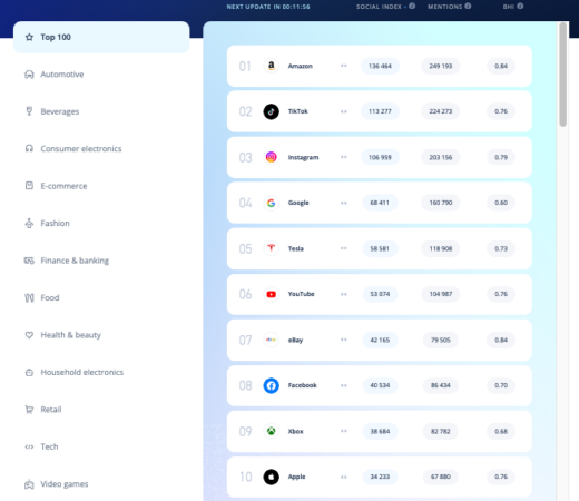 SentiCharts are refreshed every 24 hours and sorted into different categories based on business type — and it’s fully interactive. More than 700 brands are analyzed and gauged every single day, sorting through millions upon millions of mentions to see what is getting the most attention. Pick an industry, and go deeper — ecommerce, fashion, food, retail, household electronics, etc.