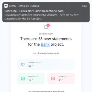 Plötzlicher Anstieg der Erwähnungen? Negative Kommentare darüber, dass Ihre Marke an Bedeutung gewinnt? Eine schlechte Bewertung von einem Influencer? Mit unseren Krisenerkennung Funktionen werden Sie bei den ersten Warnzeichen einer PR-Krise sofort benachrichtigt und haben die Chance, die Situation unter Kontrolle zu bekommen, bevor sie eskaliert.