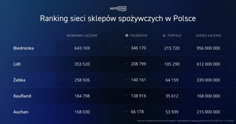 Pod względem liczby wypowiedzi oraz ich zasięgów w polskim Internecie w 2022 r. bezsprzecznie prowadzi Biedronka – dotyczy jej 643 tys. wypowiedzi, które zebrały aż 956 mln wyświetleń zasięgu. To ⅓ wszystkich wzmianek na temat dziesięciu najczęściej wymienianych sieci handlowych. Lidl zajmuje drugą pozycję z 353,5 tys. wzmianek i 612 mln wyświetleń zasięgu. Za nimi znalazły się sieci Żabka (259 tys. wzmianek i 339 mln wyświetleń) oraz Kaufland (184,7 tys. wzmianek i 168 mln wyświetleń). Pierwszą piątkę zamyka Auchan (158 tys. wzmianek i aż 215 mln wyświetleń). Kolejne miejsca pod względem liczby wzmianek zajęły sieci Dino, Carrefour, Intermarche, Społem i Selgros.