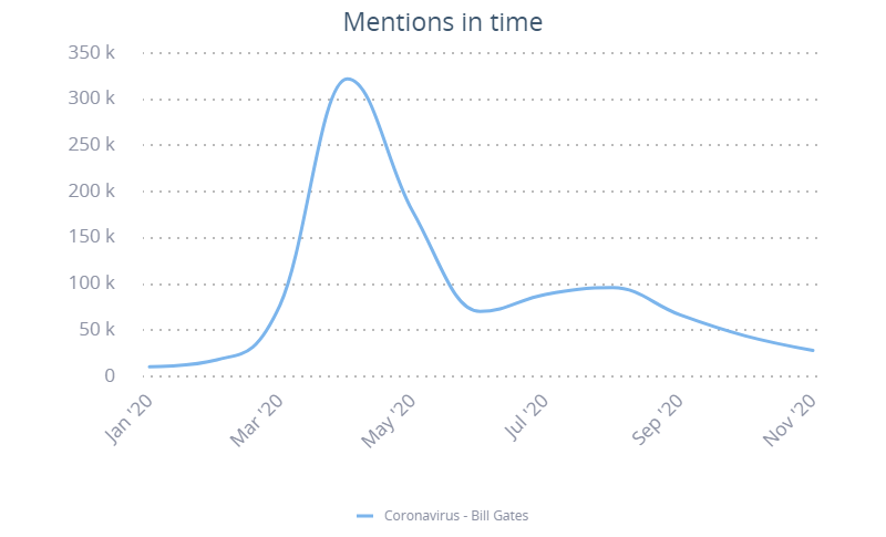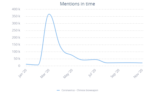 The first conspiracy theories started almost immediately after the news of the virus were disclosed. These ranged from unfounded claims that the virus was engineered as a bioweapon in a Chinese laboratory (it wasn’t). This theory found some “success” in march, but quickly dropped off – by the latter part of the year, it lost most of its appeal.
